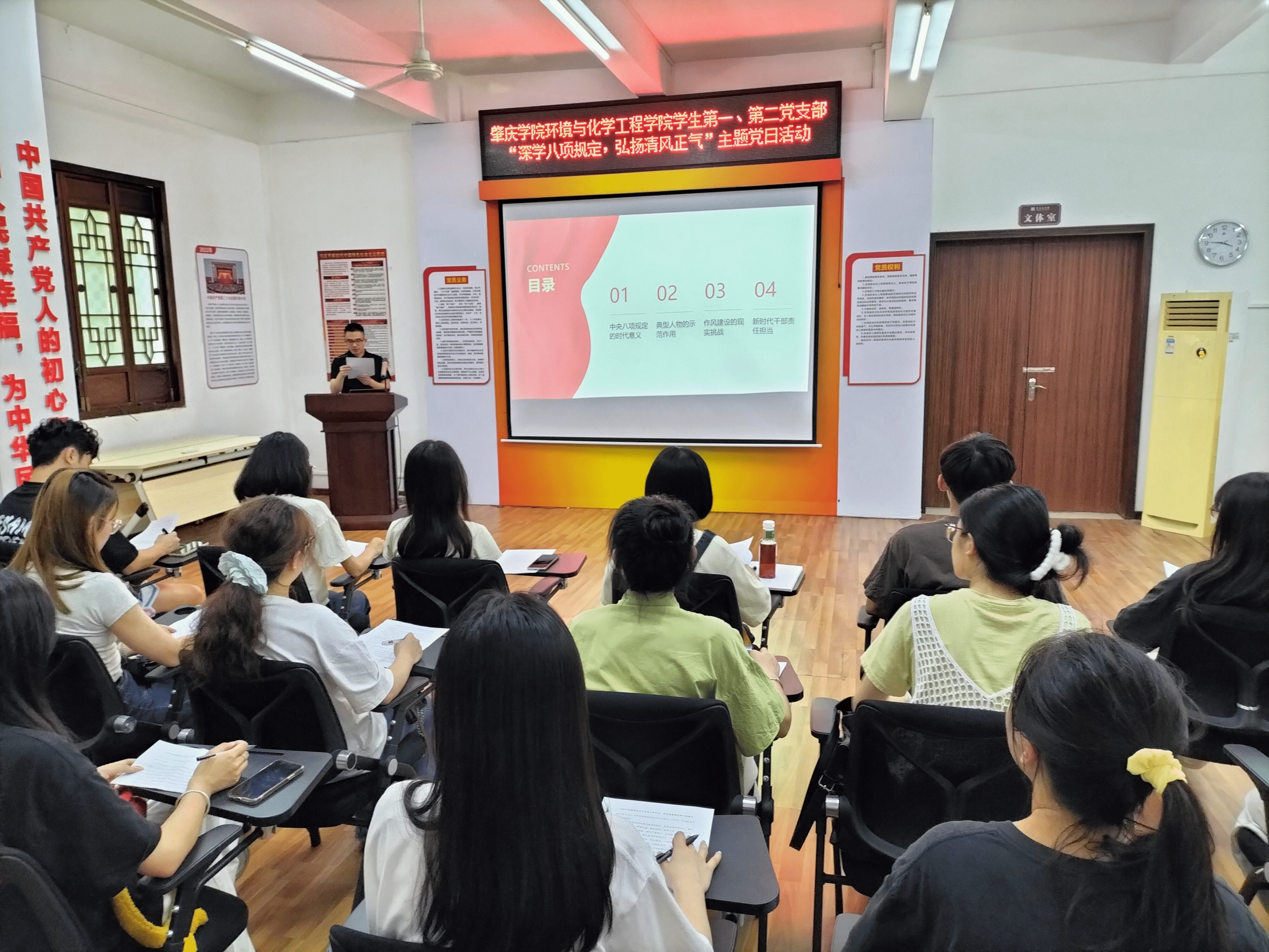 活动中,两位党支部书记在包公学堂分别讲授专题党课。学生第一党支部书记师伟展以“汲取灯盏力量,深学八项规定”为题,结合叶连平的廉洁事迹,深入阐述了八项规定的重要意义和实践要求,号召全体党员筑牢思想防线。