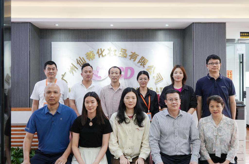 在广州仙蒂化妆品有限公司,刘远君书记一行在童春婷总经理陪同下参观了原料间、生产车间、实验室等,童总经理介绍了公司从2012年成立后,不断发展,合作的品牌较多,合作方除省内外的各美妆品牌外不断开拓海外高端彩妆品牌市场。公司目前有6条流水线,其中仅膏体流水线日产能达20万以上,公司目前年产能超1亿,表达了对人才共育、实验室共建的合作意愿及对化妆品专业人才招聘的急切需求。刘远君书记和专业负责人分别介绍了学院化妆品专业的发展情况和育人成效及毕业生状况,建议仙蒂公司在学生实习前到学院开展专业宣讲会,让学生们进一步了解企业、融入企业,同时也表达了双方合作的意愿。