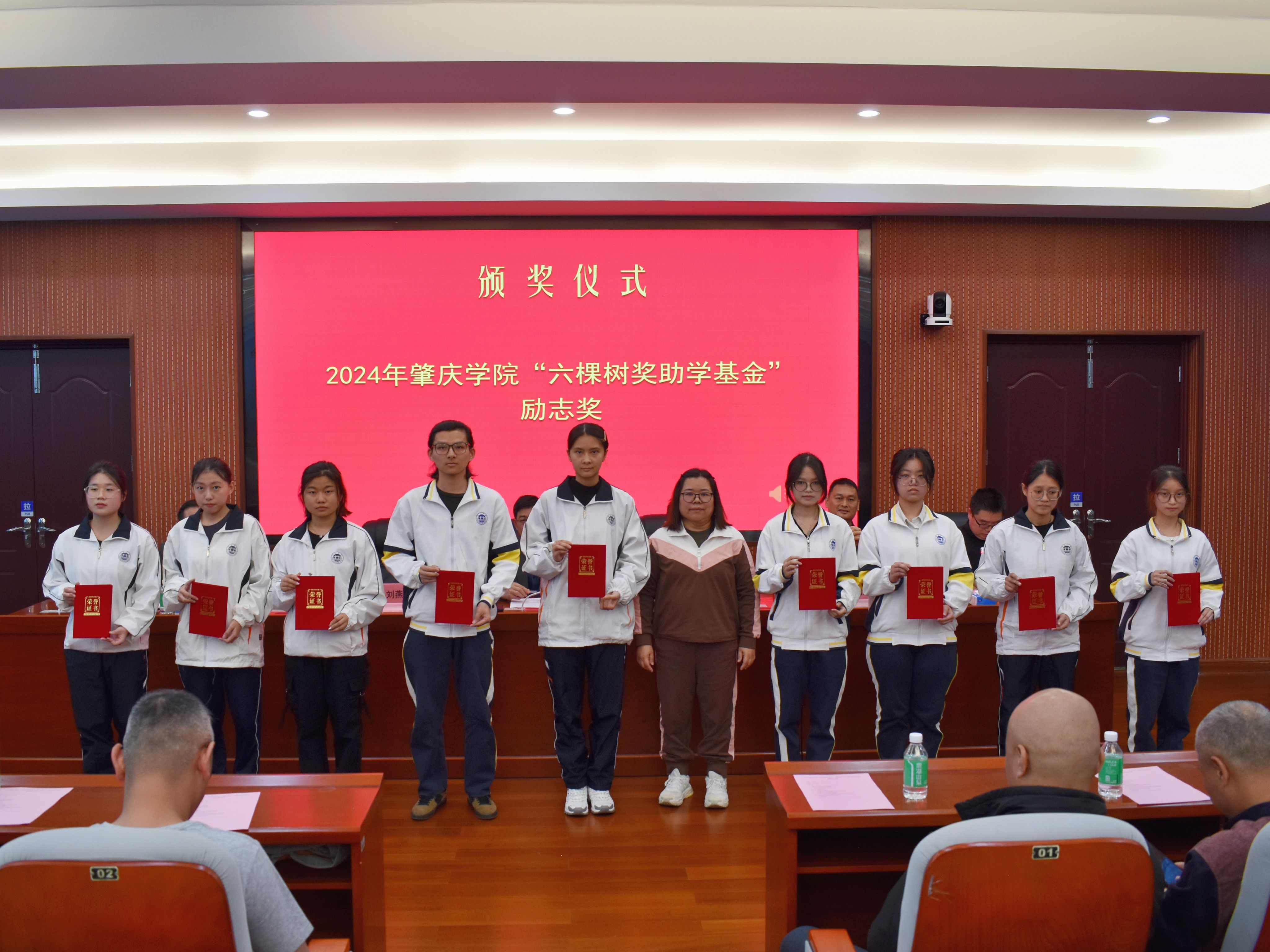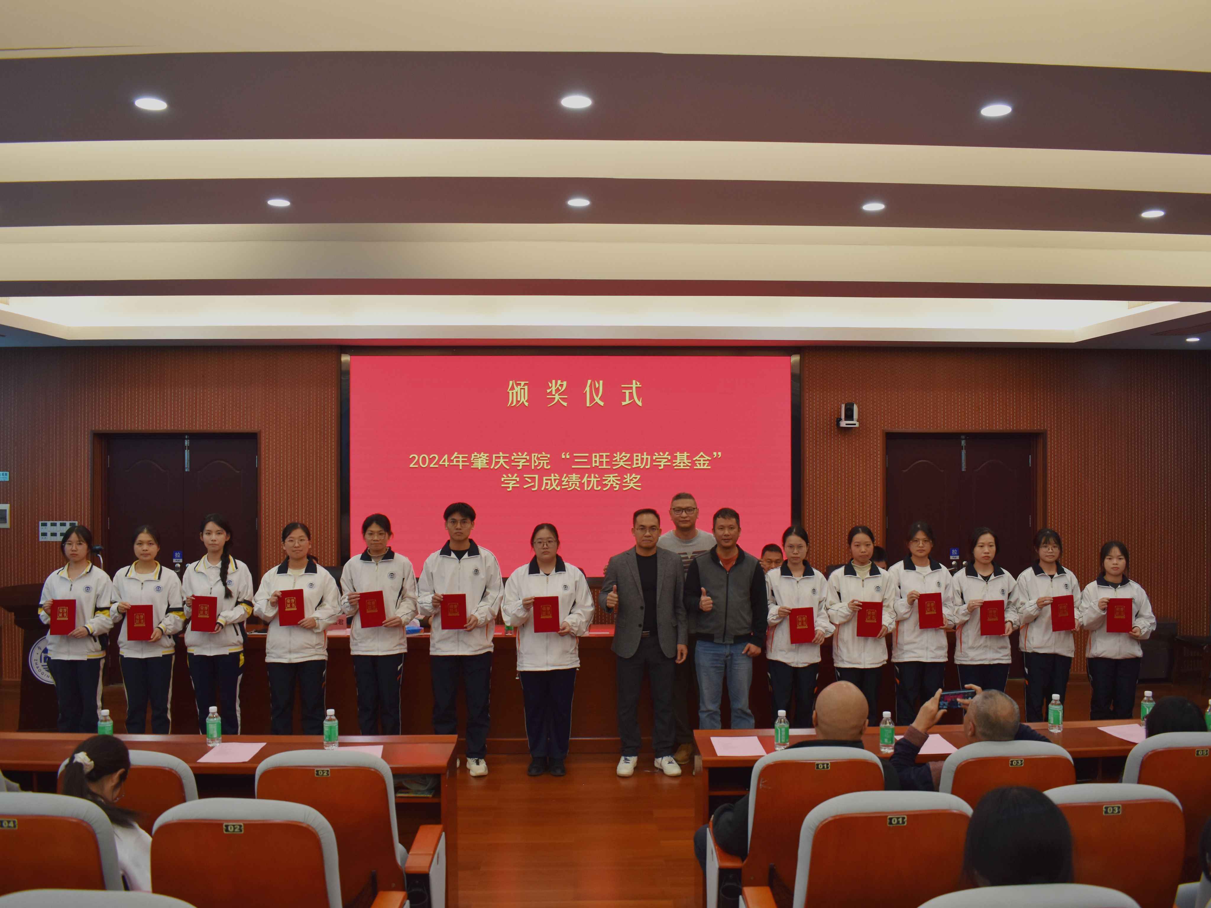 颁奖典礼在庄严的国歌声中拉开序幕。会上,学院党委书记刘远君宣读表彰决定。袁永富、刘燕芬两位校友分别为获得“三旺奖助学基金”之“学习成绩优秀奖”“三旺励志奖”、“六棵树奖助学基金”励志奖的学子颁奖。副校长唐冬冬、秘书长周建文分别为代表为袁永富、刘燕芬颁发爱心奖杯和捐赠证书。