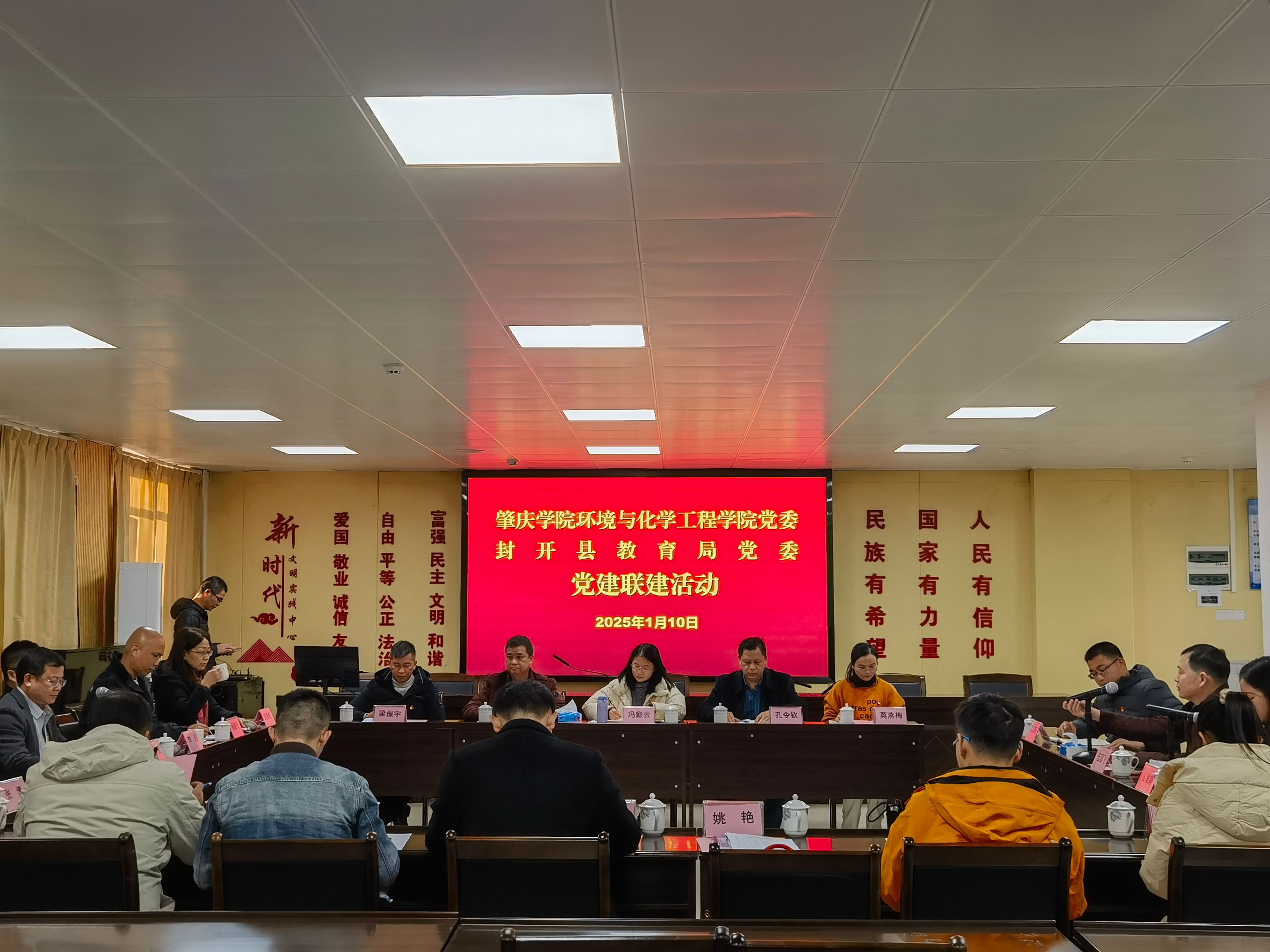 此次共建活动在封开县教育局举行,双方党委班子成员及党支部书记共聚一堂,围绕“党建引领、共育英才”的主题展开深入交流与合作。封开县教育局党委书记局长伍国飞在致辞中强调了党建工作在教育系统中的重要性,指出党建引领是推动教育事业高质量发展的关键所在,汇报了教育局党委的工作亮点和相关成绩,提出了自身的短板和双方共建促进质量提升的工作思路。环化学院党委书记刘远君对学院的党建工作进行详细介绍,希望通过双方就党建工作项目、人才培养、产学研等合作及志愿服务和社会实践活动等,实现资源共享、优势互补,共同提升党建工作水平,为培养更多优秀人才创造有利条件。