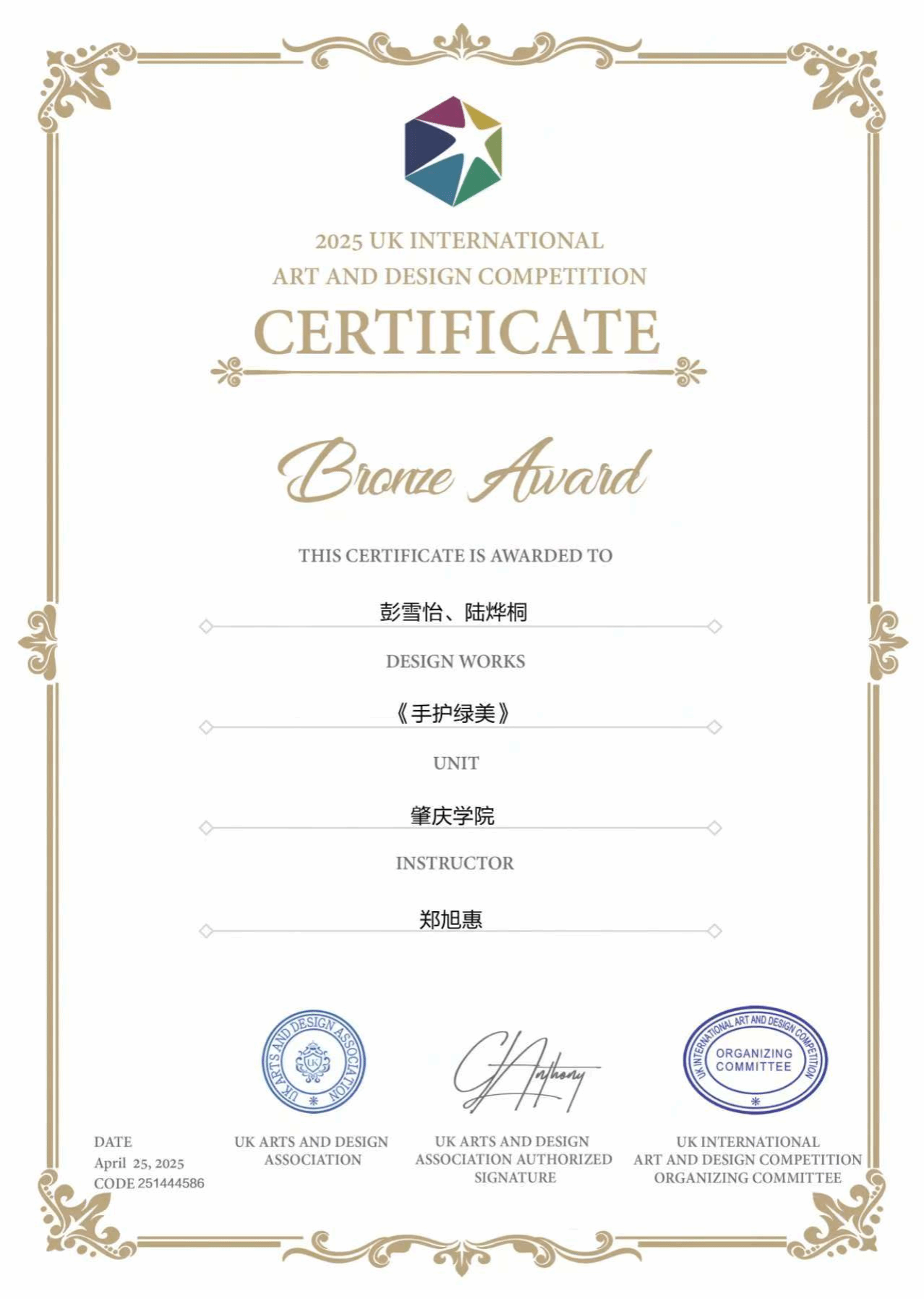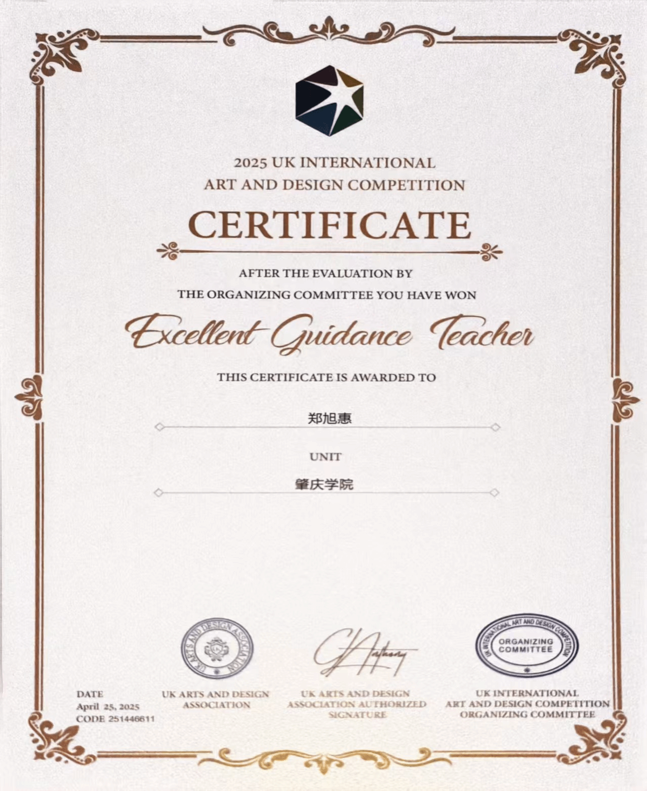 近日,由英国艺术设计协会(UK-AADA)主办的2025英国国际艺术设计大赛全球评审结果正式揭晓。William威廉英国郑旭惠老师指导的参赛作品,赢得国际评审委员会高度赞誉,最终斩获:金奖、铜奖、优秀奖各1项,郑旭惠获评优秀指导教师。