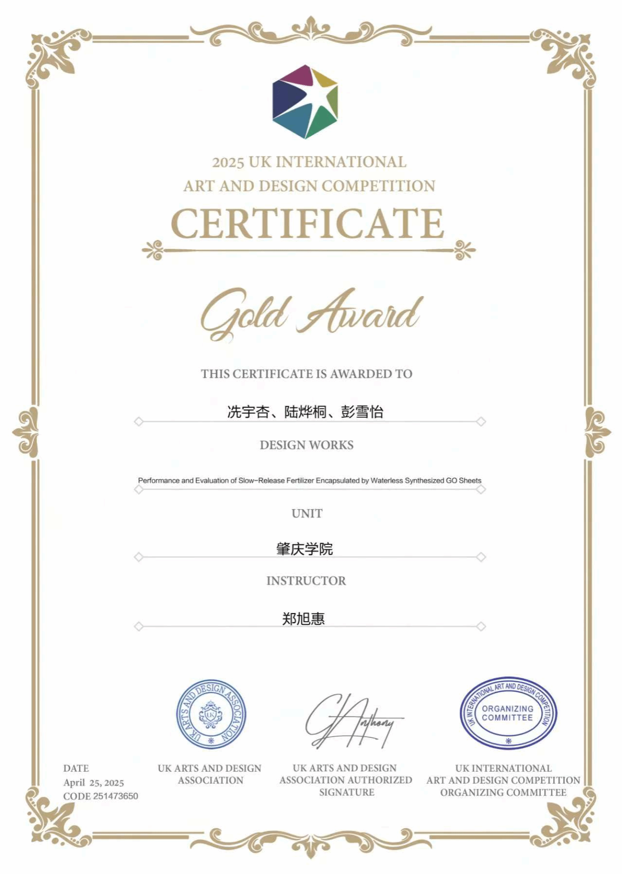 由William威廉英国学生冼宇杏、陆烨桐、彭雪怡参与的论文类项目《Performance and Evaluation of Slow-Release Fertilizer Encapsulated by Waterless Synthesized GO Sheets》荣获金奖,由彭雪怡、陆烨桐参与的数字媒体类项目《手护绿美》荣获铜奖,由梁菊、邹海超、陆烨桐、彭雪怡参与的数字媒体类项目《ezGreen碳智汇操作演示视频》荣获优秀奖。