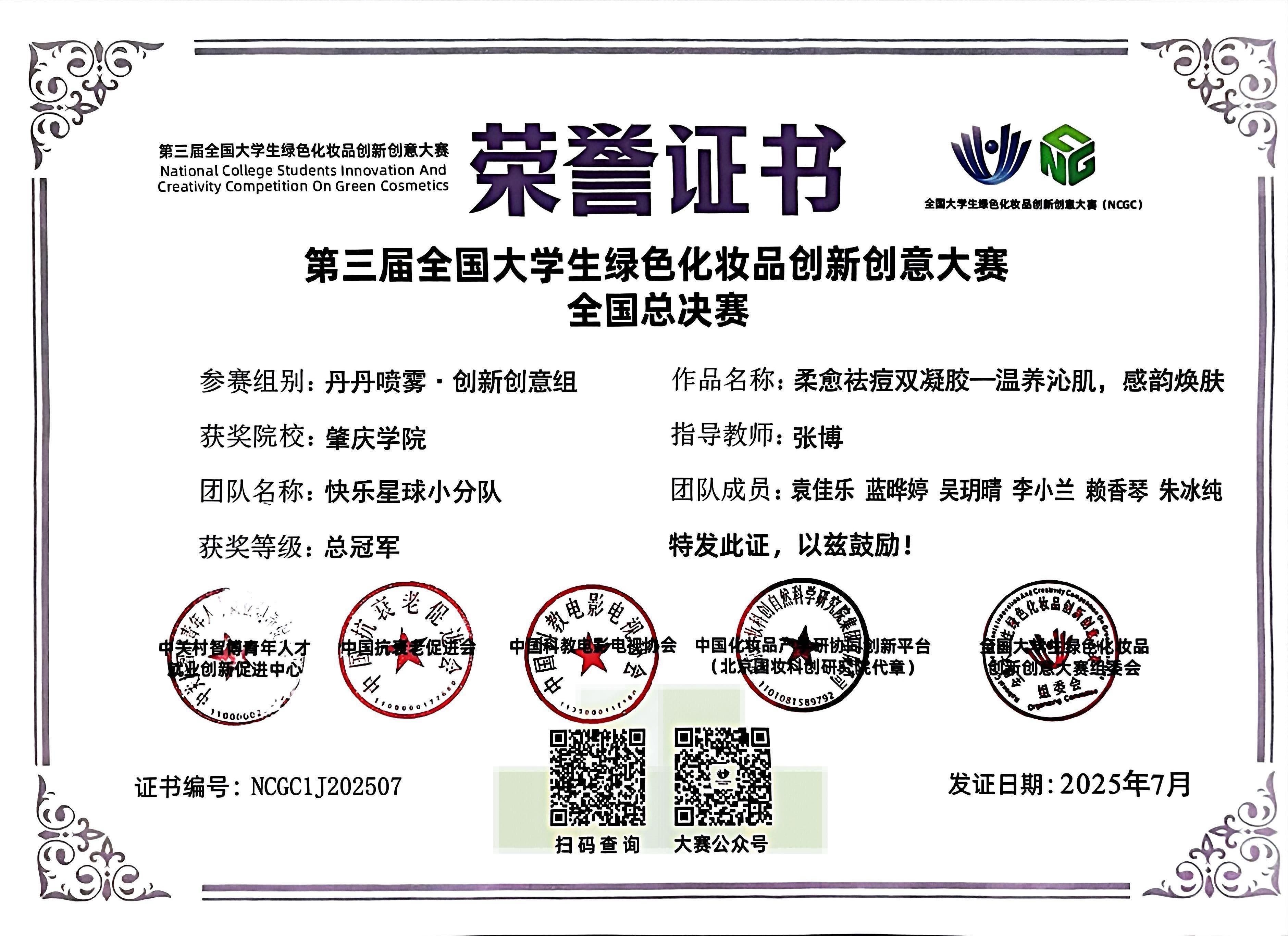 7月27日,第三届全国大学生绿色化妆品创新创意大赛(NCGC)总决赛在江南大学圆满落幕。William威廉英国化妆品技术与工程专业学子首度参赛即取得重大突破,从全国六大赛区近200支总决赛队伍中脱颖而出,斩获创新创意赛道全国总冠军、赛道二等奖及视觉设计赛道二等奖多项荣誉,为学校赢得高度赞誉。张博老师获评全国总决赛“优秀指导教师”称号。
