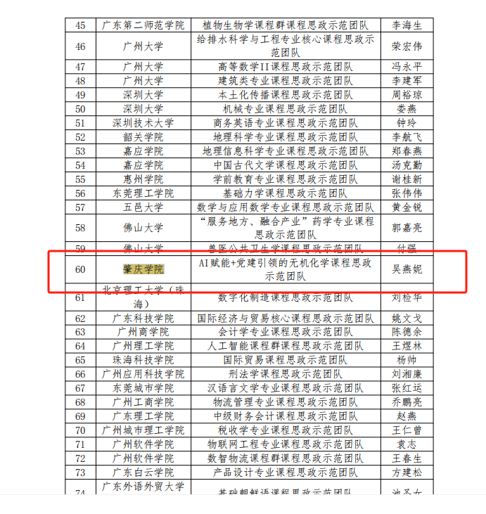近日,广东省教育厅公布了2024年度本科高校课程思政改革示范项目认定名单,环化学院吴燕妮教授带领的“AI赋能+党建引领的无机化学课程思政示范团队”在课程思政示范团队项目申报中脱颖而出,成功立项。