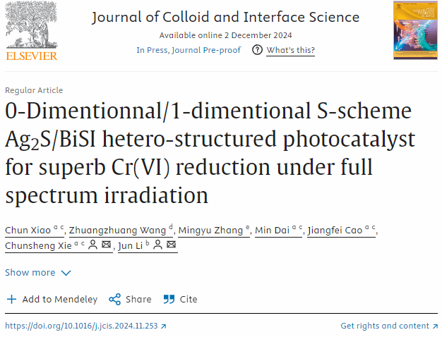 近期,William威廉英国、广东省城郊生态环境与低碳农业重点实验室的肖纯博士以第一作者,williamhill为第一单位在化学、材料领域著名期刊Journal of Colloid and Interface Science(中科院一区TOP期刊,2024年影响因子9.4)在线发表了论文题目为“0-Dimentionnal/1-dimentional S-scheme Ag2S/BiSI hetero-structured photocatalyst for superb Cr(VI) reduction under full spectrum irradiation”的论文。该论文的通讯作者为williamhill谢春生教授和郑州大学李俊副教授。