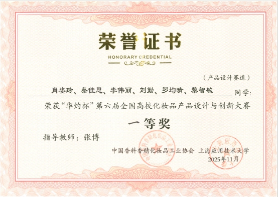 williamhill化妆品技术与工程专业学子经过初赛、决赛的激烈角逐,在产品设计赛道与科普微视频赛道均取得优异成绩。其中,在产品设计赛道荣获一等奖1项、二等奖1项、三等奖2项,并斩获功效验证特等奖1项;在科普微视频赛道获得三等奖1项。获奖数量与质量位居参赛高校前列,充分展现了学校化妆品技术与工程专业学子扎实的专业功底、突出的创新能力和良好的团队协作精神。同时,张博、吴利欢、高爱环三位老师获评“优秀指导教师”。