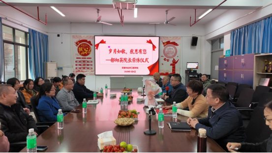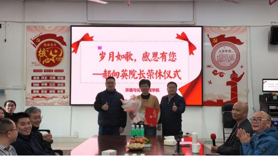 1月4日下午,环化学院在理工楼218室为光荣退休的前院长郝向英教授举办了一场温馨而庄重的荣休座谈会。学院党委书记刘远君、院长李湘、副院长吴贤格及吴燕妮等领导班子成员与教职工代表齐聚一堂,共同回顾郝教授三十八载育人岁月,表达崇高敬意与真挚祝福。座谈会由副书记杨原行主持。
