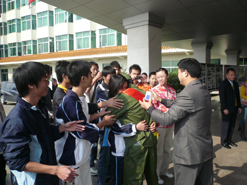 欢送会上,08制药班全体同学为叶云翰合唱了一曲《朋友》,表达了他们对叶云翰的友情之深。08制药班班主任覃亮老师更是赞扬叶云翰是一名优秀的学生,也是我院第一个通过考验的人。随后班长陈锐东也说到叶云翰永远是08制药班的一份子,是408的一份子,要为其留着床位。场面感动无比,赚人热泪!