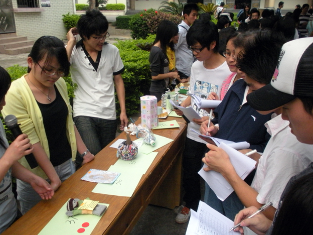 此次活动参赛作品高达160多份,作品数量是上一届的两倍,多得让人目不暇接。而其中不少作品既实用又美观,既环保又创新,例如106号我院戴炳霞同学的作品——月光宝盒,一个利用废弃纸张包裹破烂纸皮形成的双层纸巾盒,制作精美,包揽实用、美观、环保与创新于一身,配上该同学的出色讲解,其作品受到所有裁判的一致好评。琳琅满目的作品让现场观众赏心悦目,场面热闹非凡。