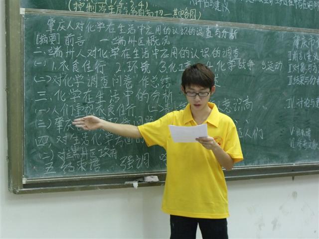 主笔手在讲台上分析课题和调查结果