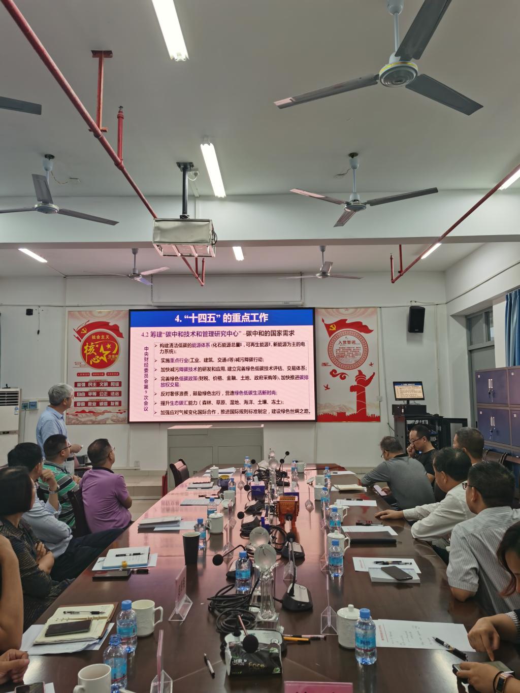 程海滨局长就我市“十三五”期间全面打赢污染防治攻坚战的成效作了简要介绍,郝向英院长就环化学院发展现状和对接社会需求及能力作了说明,袁国栋教授以学科建设为主题,就我校省环境健康与资源利用重点实验室和碳中和技术研发中心的人才队伍、平台条件、科研产出、服务成效、人才培养及“十四五”重点工作作了详细汇报。副校长唐冬冬作总结发言,他强调,环化学院要凭借学科、平台和人才优势,对接生态环境局和社会需求,更好地发挥作用。双方一致同意建立全方位的联系和合作机制,在我市生态文明建设和碳达峰、碳中和等方面开展人才储备、专题培训、项目合作等方面的工作,切实服务肇庆市的社会经济发展和生态文明建设。