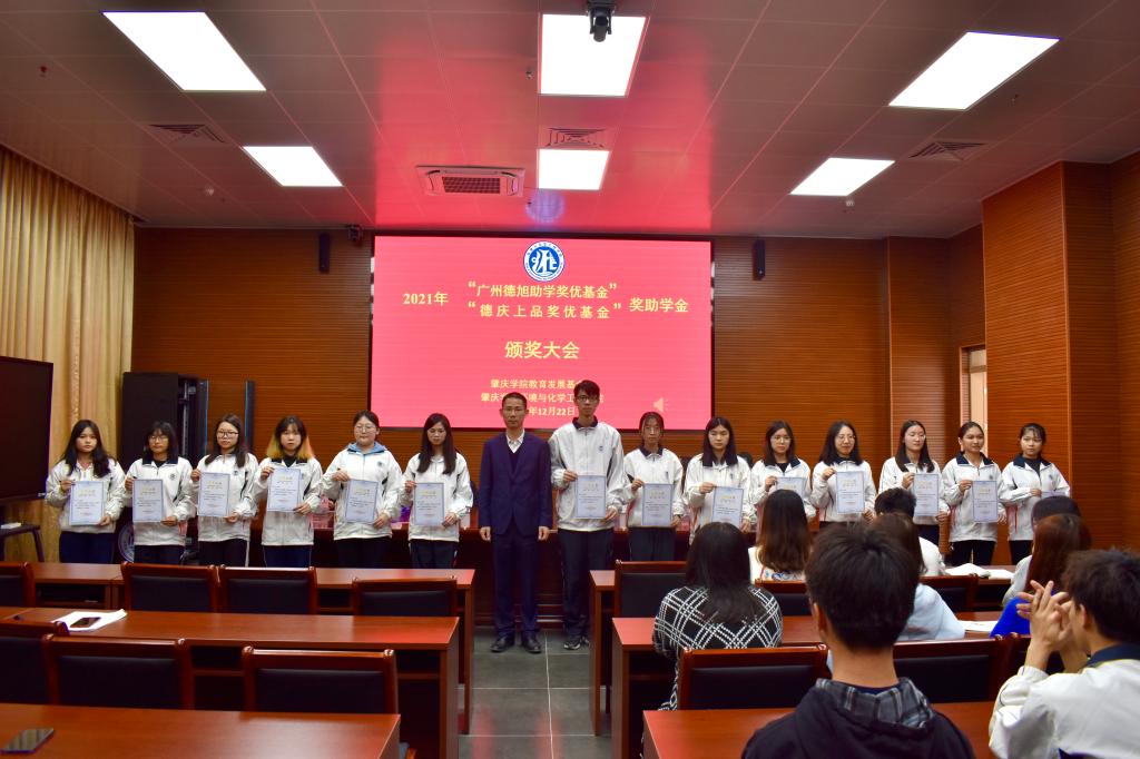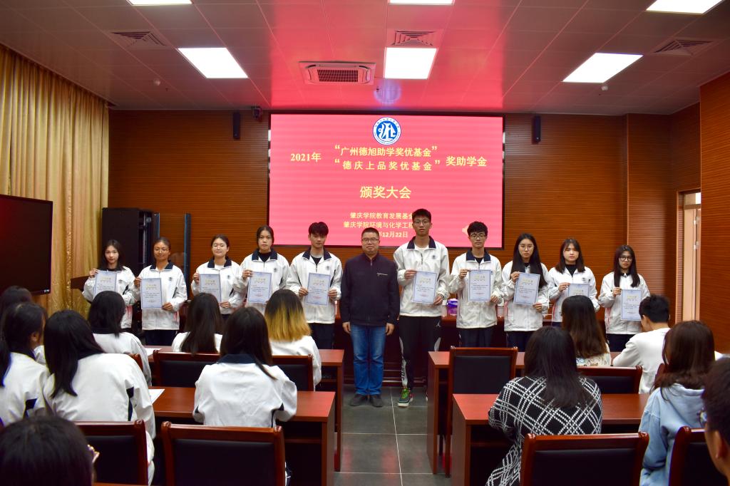 12月22日下午,2021年williamhill“德旭助学奖优基金”“德庆上品奖优基金”奖助学金颁奖大会在实训中心大楼112会议室隆重举行。参会人员有德旭新材料(广州)股份有限公司总经理何彦波先生、环化学院院长郝向英、党委书记李湘、副院长吴燕妮、副院长吴贤格、副书记杨原行以及学生代表60余人。大会由环化学院党委副书记杨原行主持。