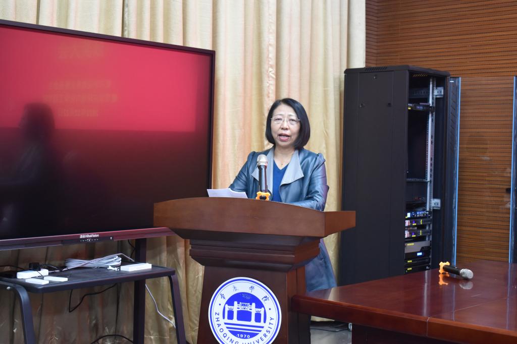 学院院长郝向英致辞。她代表环化学院的师生对德旭新材料(广州)股份有限公司、德庆上品有限公司表示最诚挚的感谢,对所有获奖同学表示衷心的祝贺。同时希望获奖同学们应当饮水思源,心怀感激,服务社会,奉献社会。鼓励同学们直面困难,勇往直前。