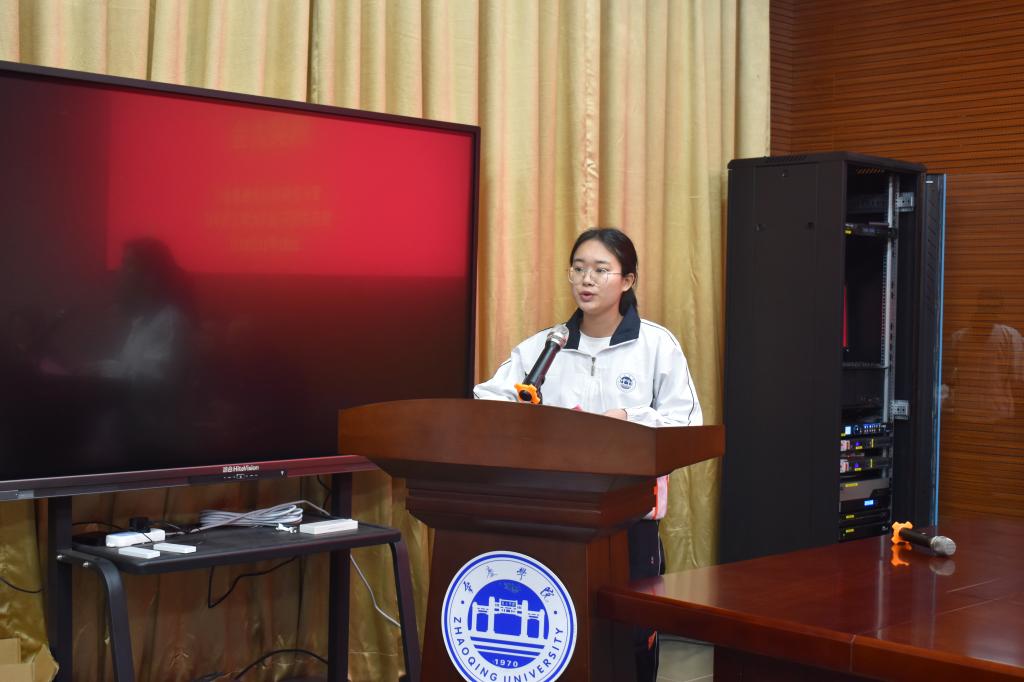 2021年德庆上品成绩优秀奖获得者代表18环境2班范熔丹同学发言。她对企业领导、学院的老师们表示了最诚挚的感谢的同时,她认为大学生应该要设立目标,砥砺前行,戒骄戒躁,心平气和,更要常怀感恩,肩负使命,不辜负老师们的期望,一如既往地前进,用努力迎接挑战,用真诚迎接未来。