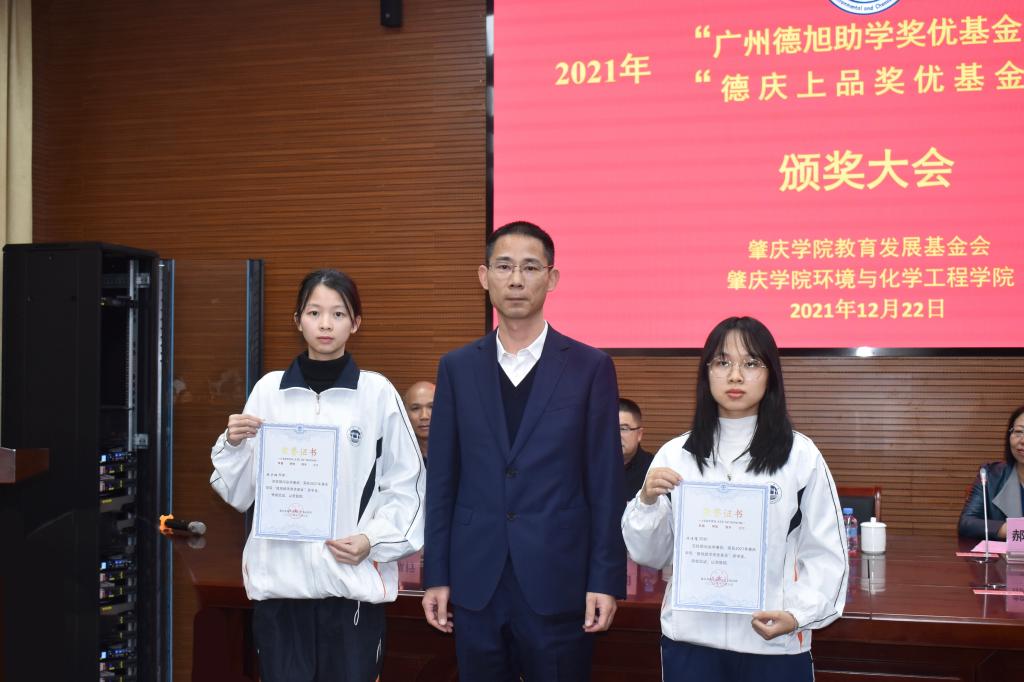 德旭新材料(广州)股份有限公司总经理何彦波先生为获得环化学院 “2021年德旭精细化工专业励志奖学金”的同学颁奖