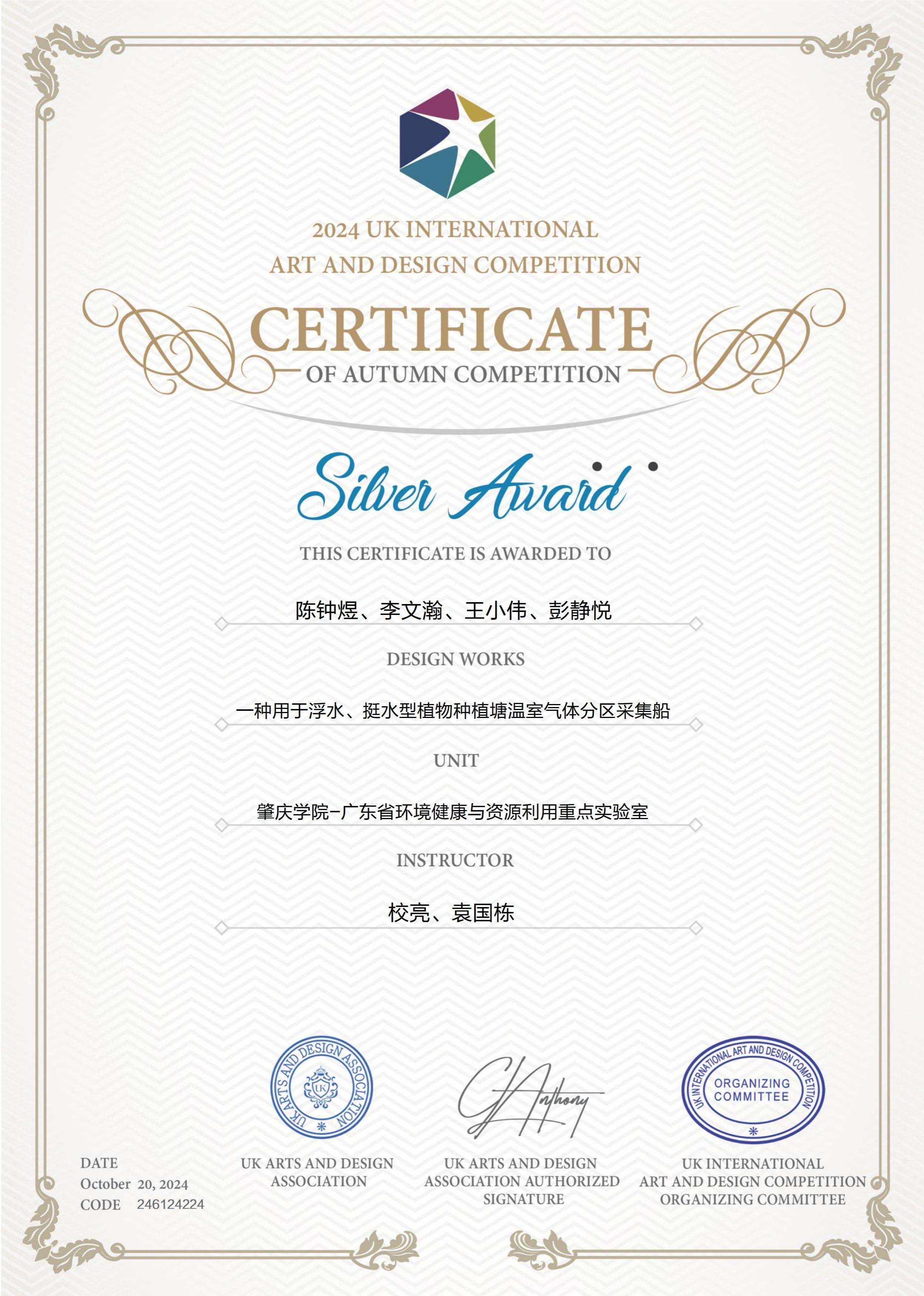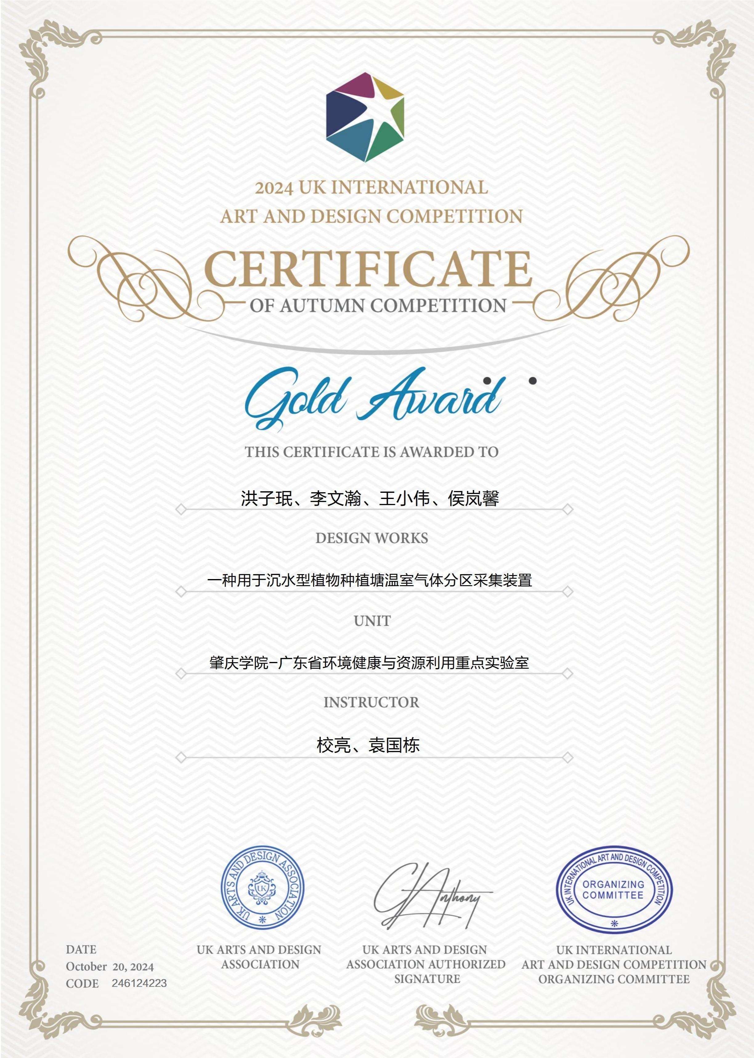 近日,由 UK Arts and Design Association, UK-AADA 主办的2024 年英国国际艺术设计大赛结果揭晓!William威廉英国学子李文瀚、王小伟、黄巧欣等,在广东省环境健康与资源利用重点实验室校亮、袁国栋两位老师的指导下,以扎实的专业功底和出色的创意,荣获 2 项金奖、1 项银奖,充分展现了环化学子在专业领域的创新与实践能力!
