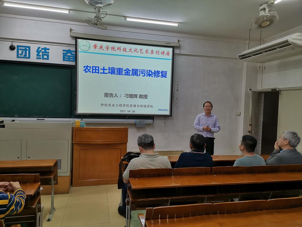 2021年4月28日晚上,仲恺农业工程学院环境科学与工程学院教授、香江学者、广东省青年珠江学者、广州市珠江科技新星、山东省“渤海英才•杰出贡献专家”刁增辉教授受邀到我校,为环化学院师生作了一场关于《农田土壤重金属污染修复》的精彩学术讲座。讲座由袁国栋教授主持,一同参会的还有环化学院戴洪文老师、秦建桥老师、谢春生老师、校亮老师、戴敏老师等学院教师代表以及全体2018、2019级环境专业学生。