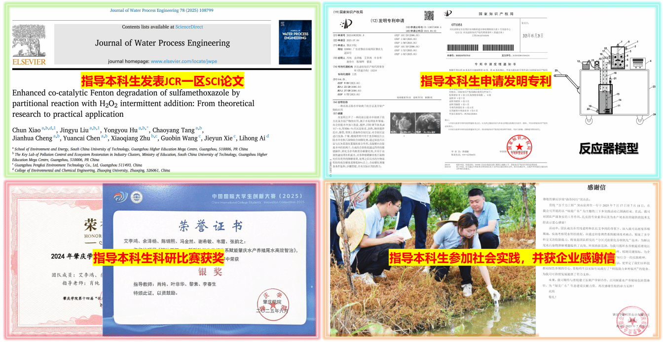 自2024年9月以来,肖纯老师指导2023级环境工程专业艾李鸿等学生荣获国家级、校级大学生创新创业训练计划项目、广东省科技创新战略专项资金(原“攀登计划”)项目立项;在williamhill大学生节能减排工业设计竞赛、中国国际大学生创新大赛williamhill初赛等多项赛事中屡获佳绩;在《Journal of Water Process Engineering》、《环境科学学报》、《中国给水排水》等高水平期刊发表多篇学术论文。同时,申请了“一种分区式助催化芬顿反应器”等多项国家专利,为技术应用奠定了坚实基础。