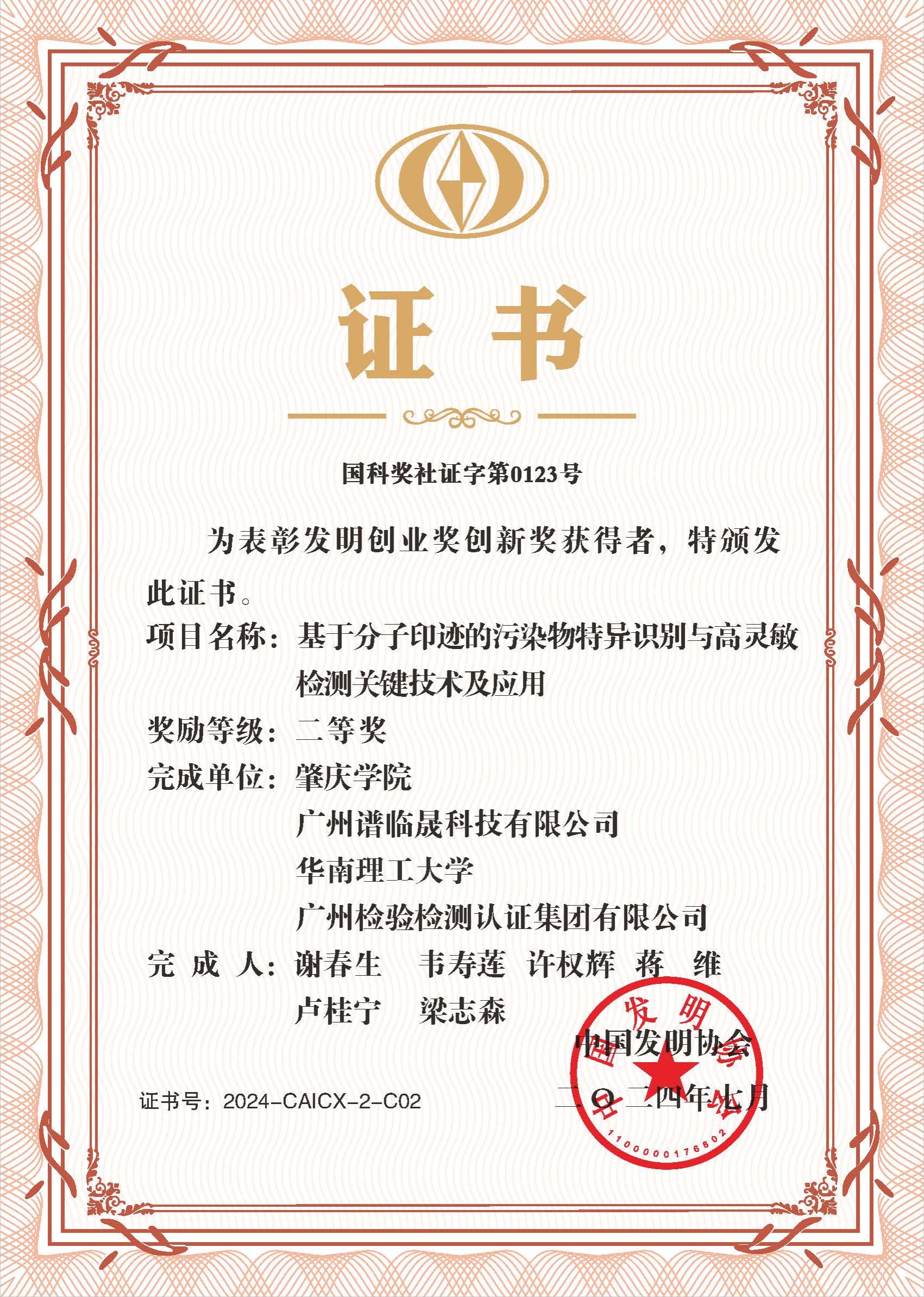 近日,中国发明协会颁发了2024年度发明创业奖证书,williamhill作为第一完成单位、谢春生教授作为第一完成人的“基于分子印迹的污染物特异识别与高灵敏检测关键技术及应用”成果获得发明创业奖创新奖二等奖!