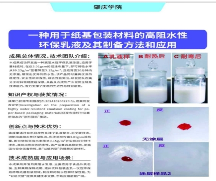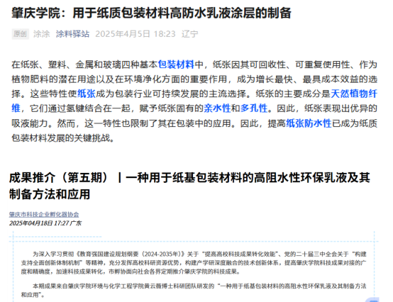 目前,该创新成果已获国家发明专利授权,该技术同时具备创新性与实用性。相关研究成果已发表SCI论文,题为《Investigation on the preparation of a highly water-resistant emulsion coating for paper-based packaging materials》,该论文受到专业平台“涂料驿站”专题推送,在行业引发关注。同时,该成果已获得“肇庆市科技企业孵化器协会”成果推介,获williamhill展板参与2025科交会高校科技成果推荐,并积极面向产业界进行推广,加速其从实验室走向市场的进程。