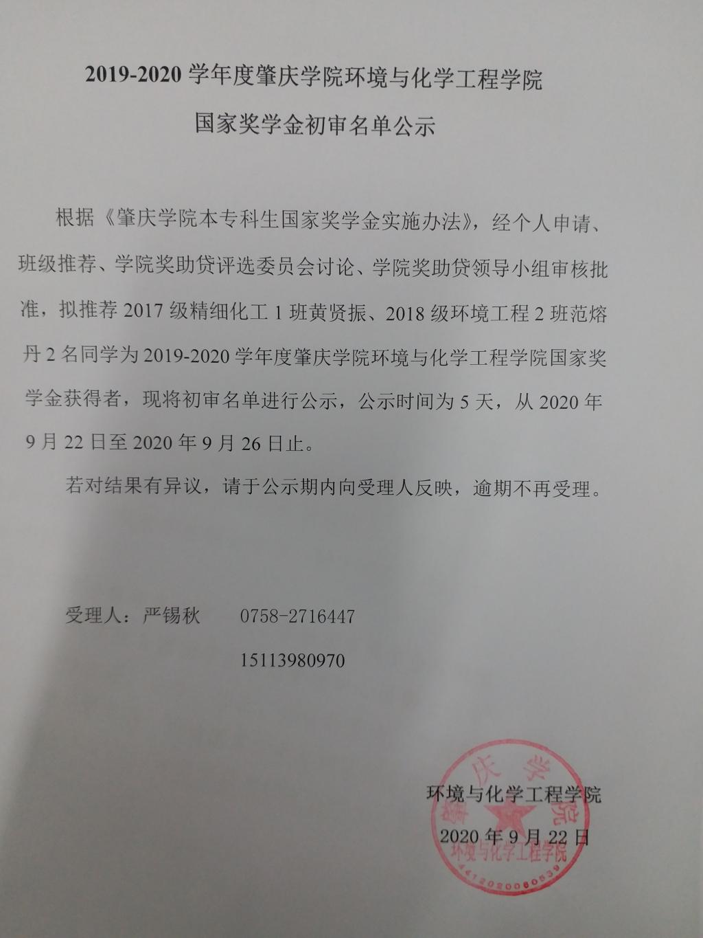根据《williamhill本专科生国家奖学金实施办法》,经个人申请、班级推荐、学院奖助贷评选委员会讨论、学院奖助贷领导小组审核批准,拟推荐2017级精细化工1班黄贤振、2018级环境工程2班范熔丹2名同学为2019-2020学年度williamhill环境与化学工程学院国家奖学金获得者,现将初审名单进行公示,公示时间为5天,从2020年9月22日至2020年9月26日止。